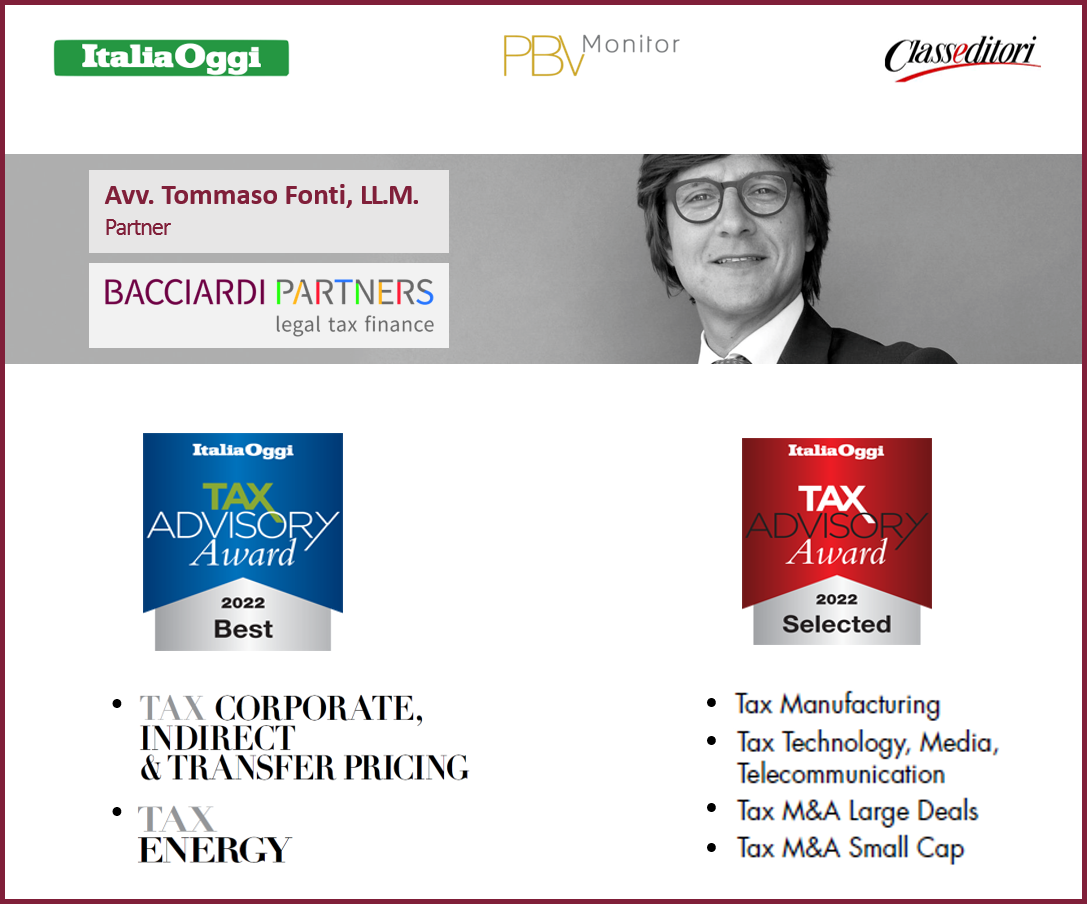 Nell’indagine di Italia Oggi e PBV Monitor il nostro partner Tommaso Fonti, LL.M. e il nostro studio Bacciardi Partners sono stati recensiti, rispettivamente, come Professionista e Studio di riferimento in ben 6 aree di pratica fiscale.